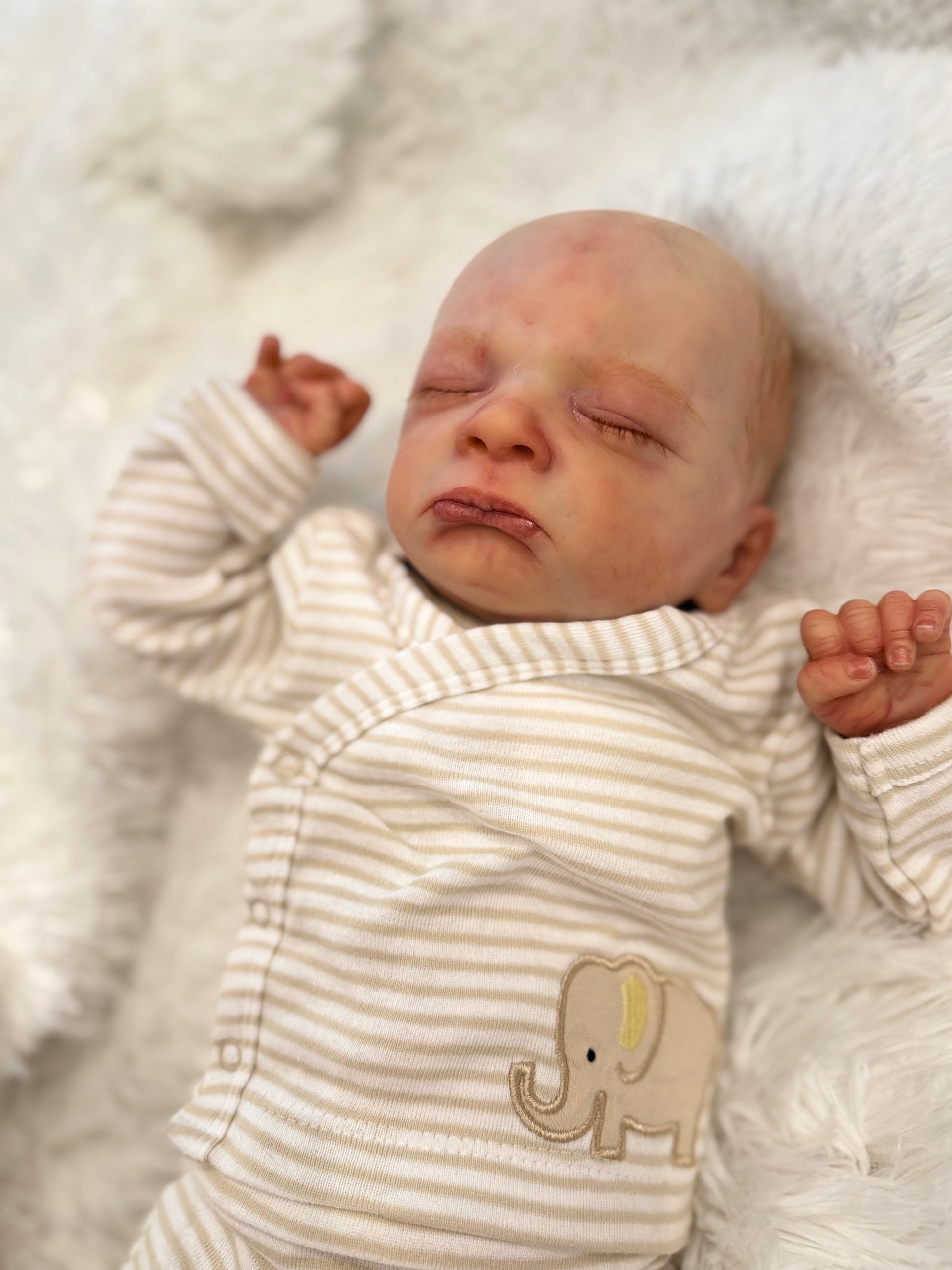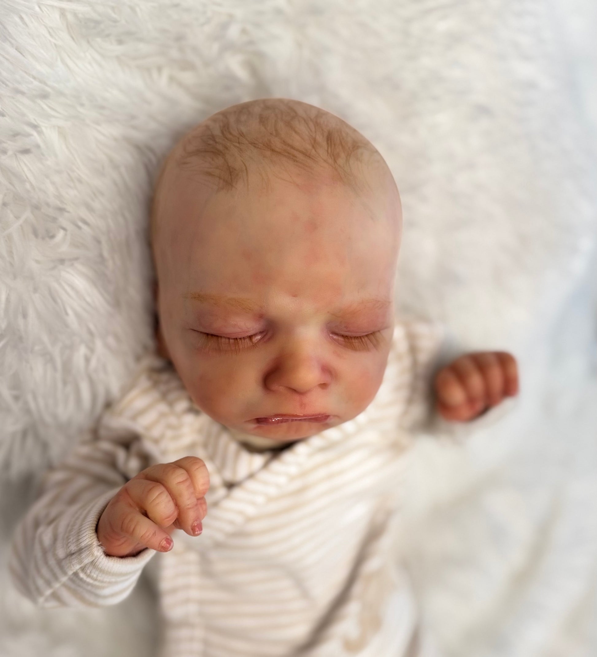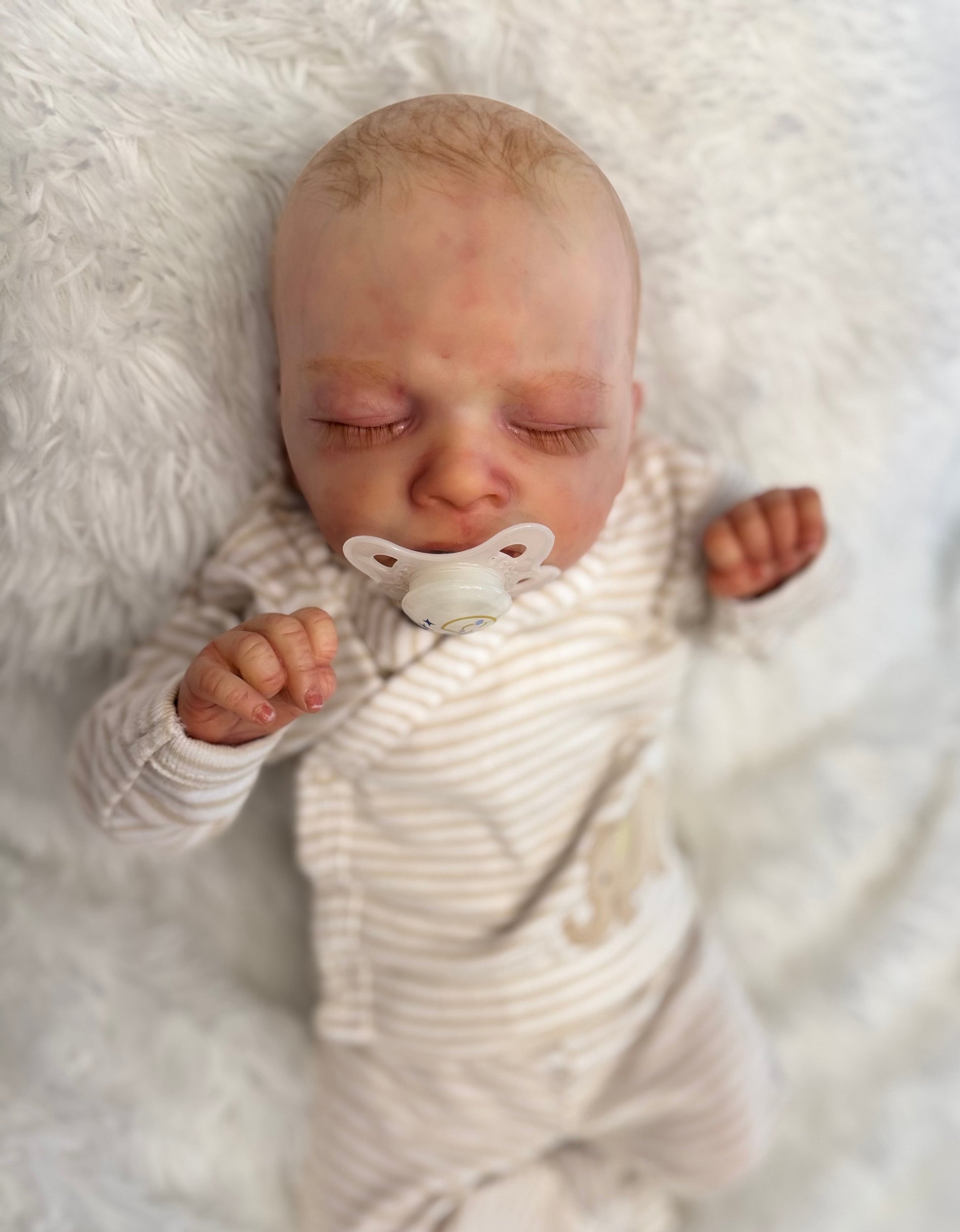 Milan is 19 inches, 6.5 pounds, comes with magnetic pacifier, wears newborn size clothing. This baby is weighted with fine glass beads to feel real and painted with heat set paints. He is 10/1000 sculpt from Olga Auer and comes with COA