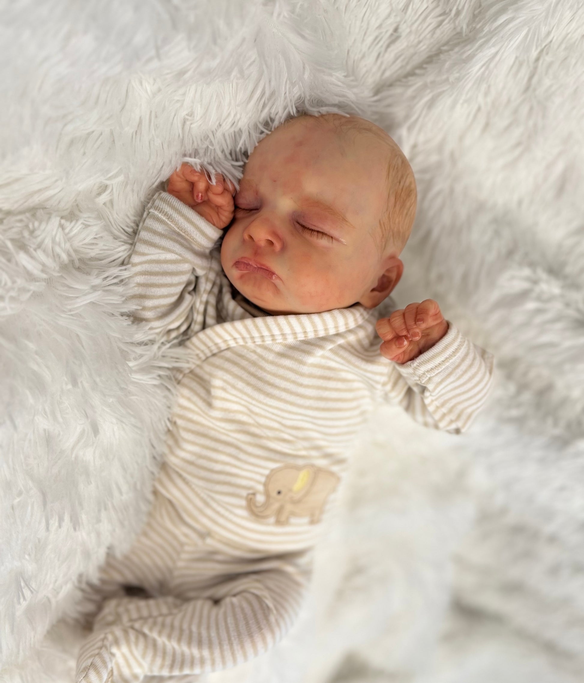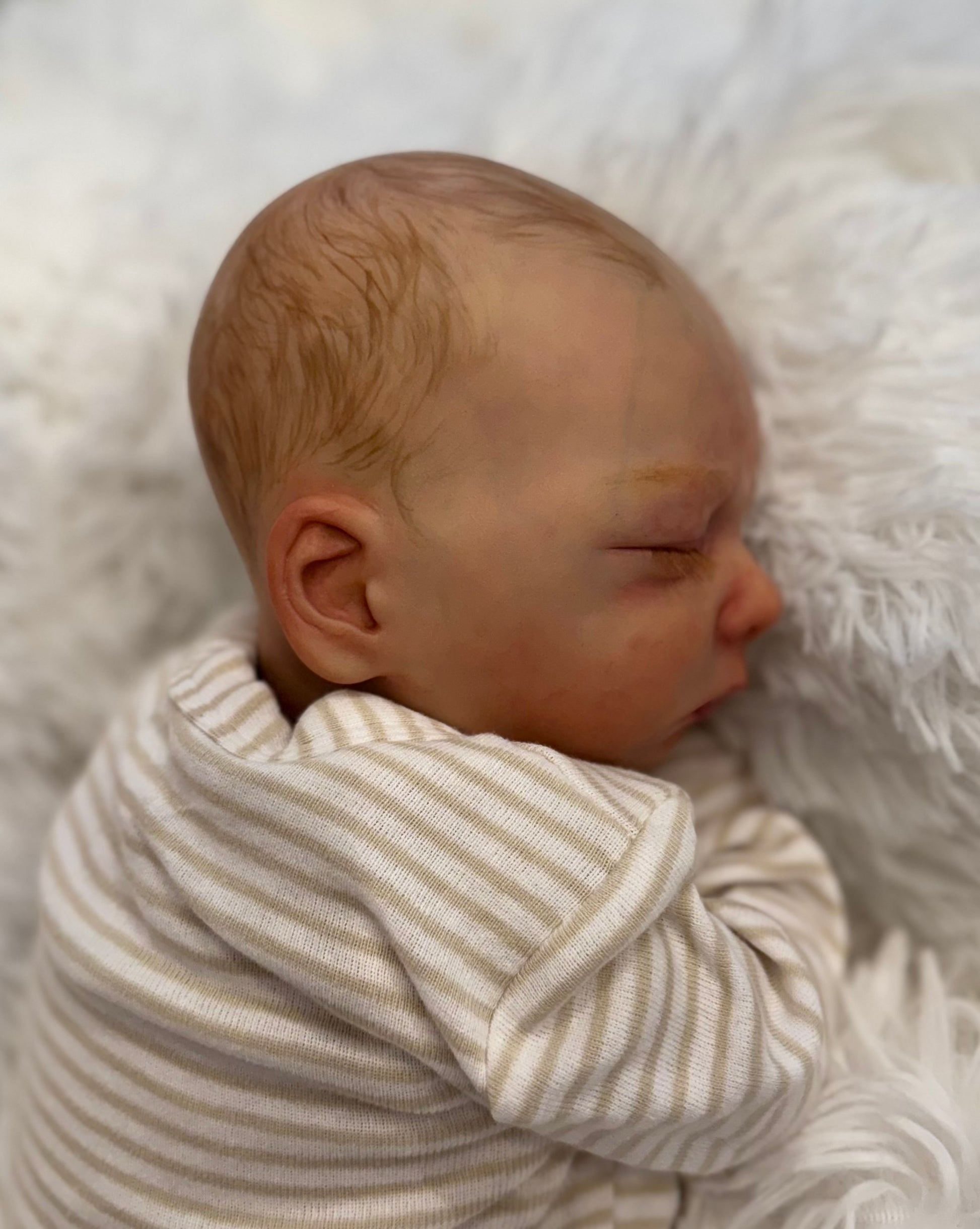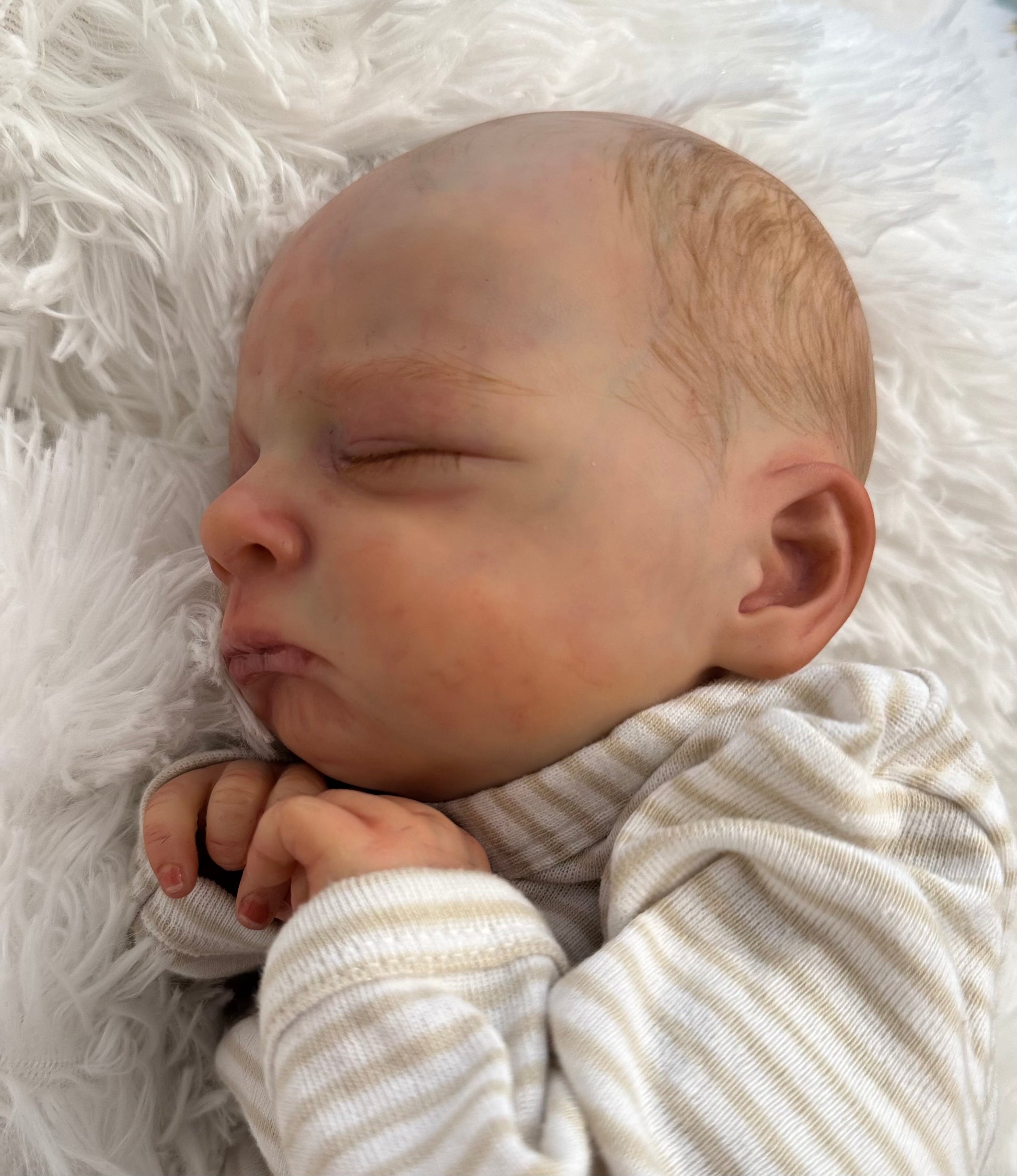 Milan is 19 inches, 6.5 pounds, comes with magnetic pacifier, wears newborn size clothing. This baby is weighted with fine glass beads to feel real and painted with heat set paints. He is 10/1000 sculpt from Olga Auer and comes with COA
