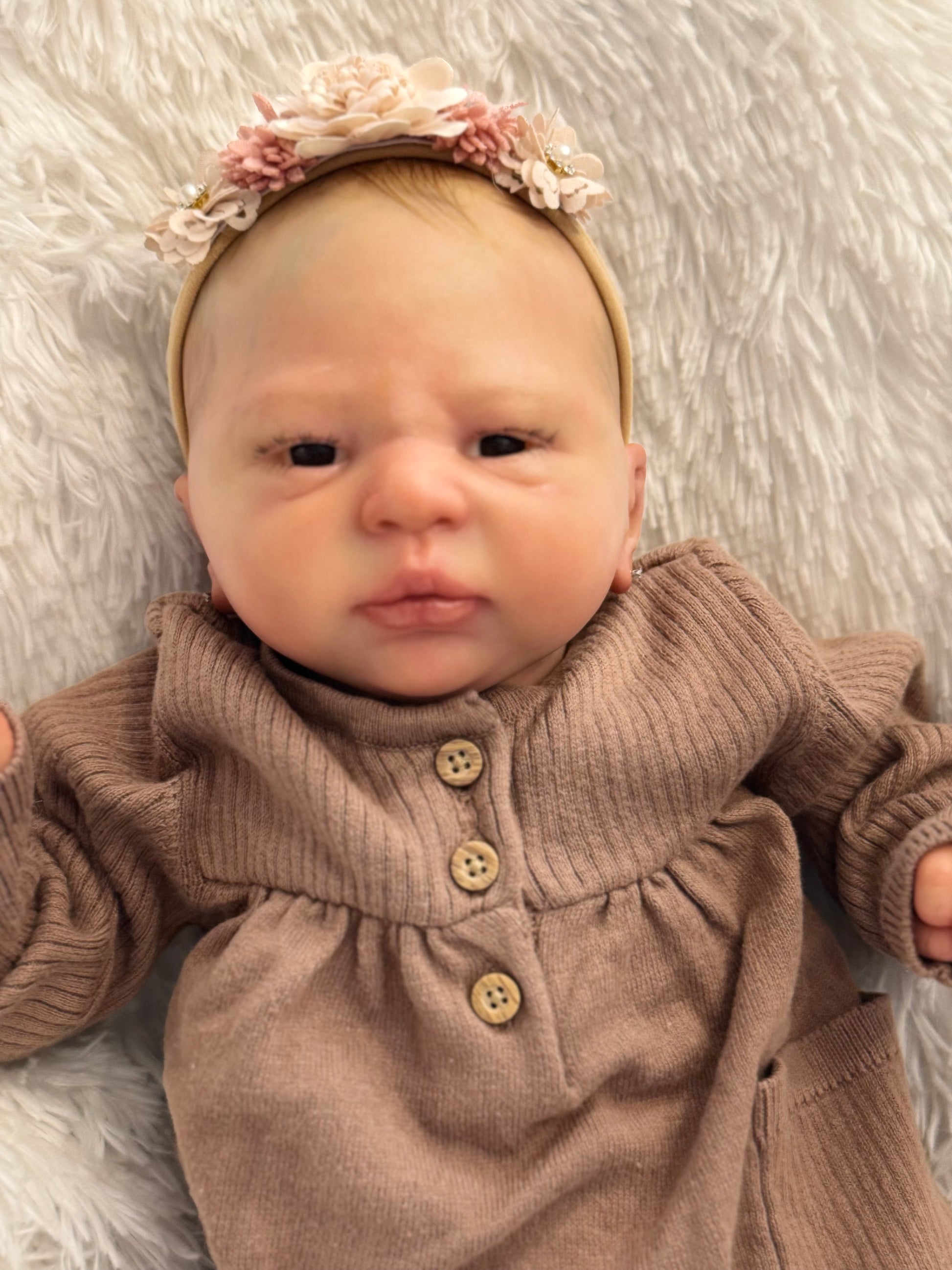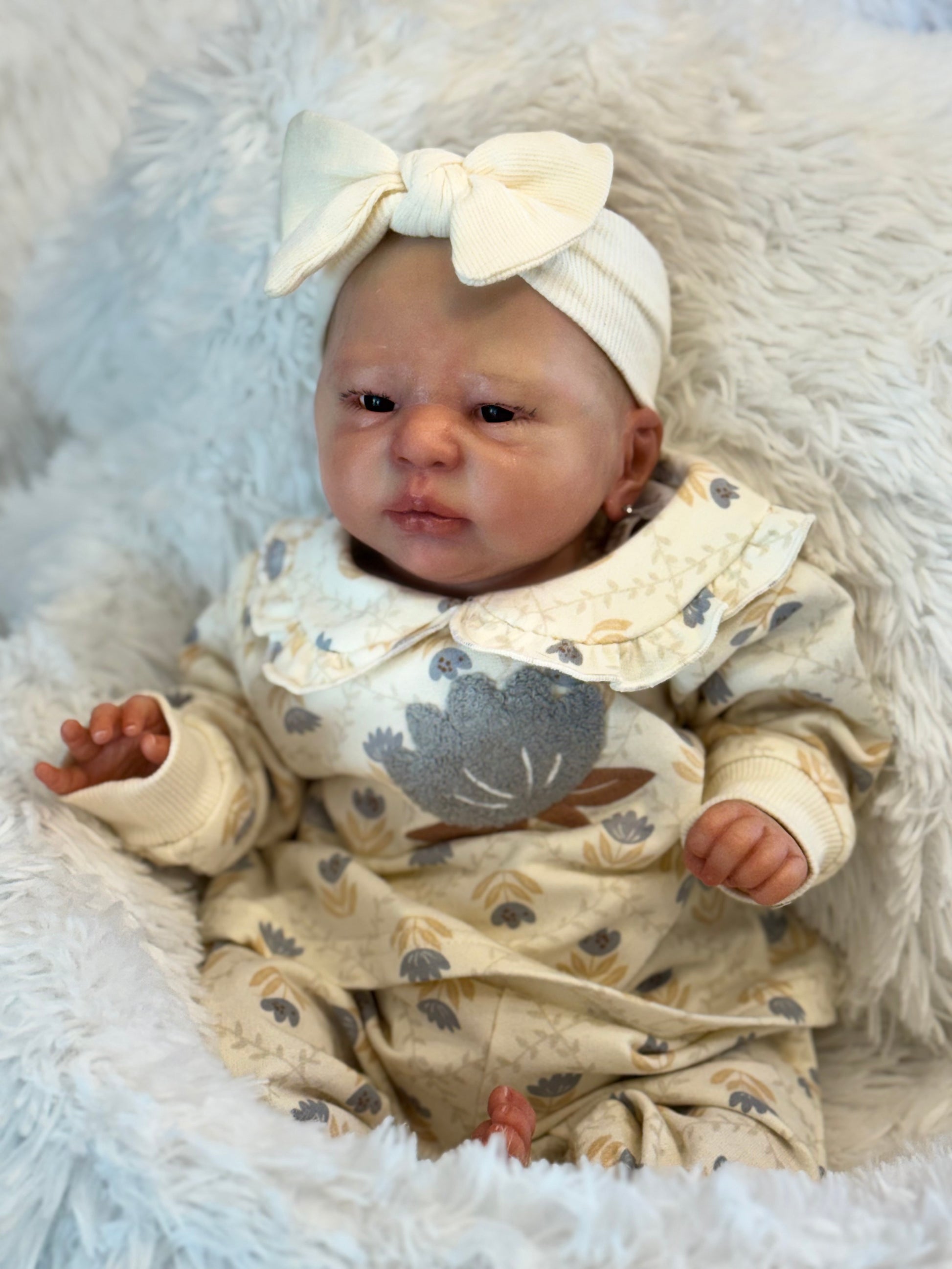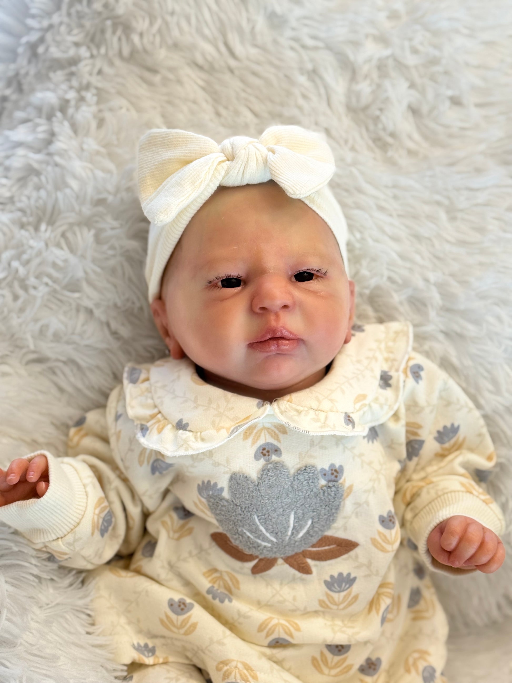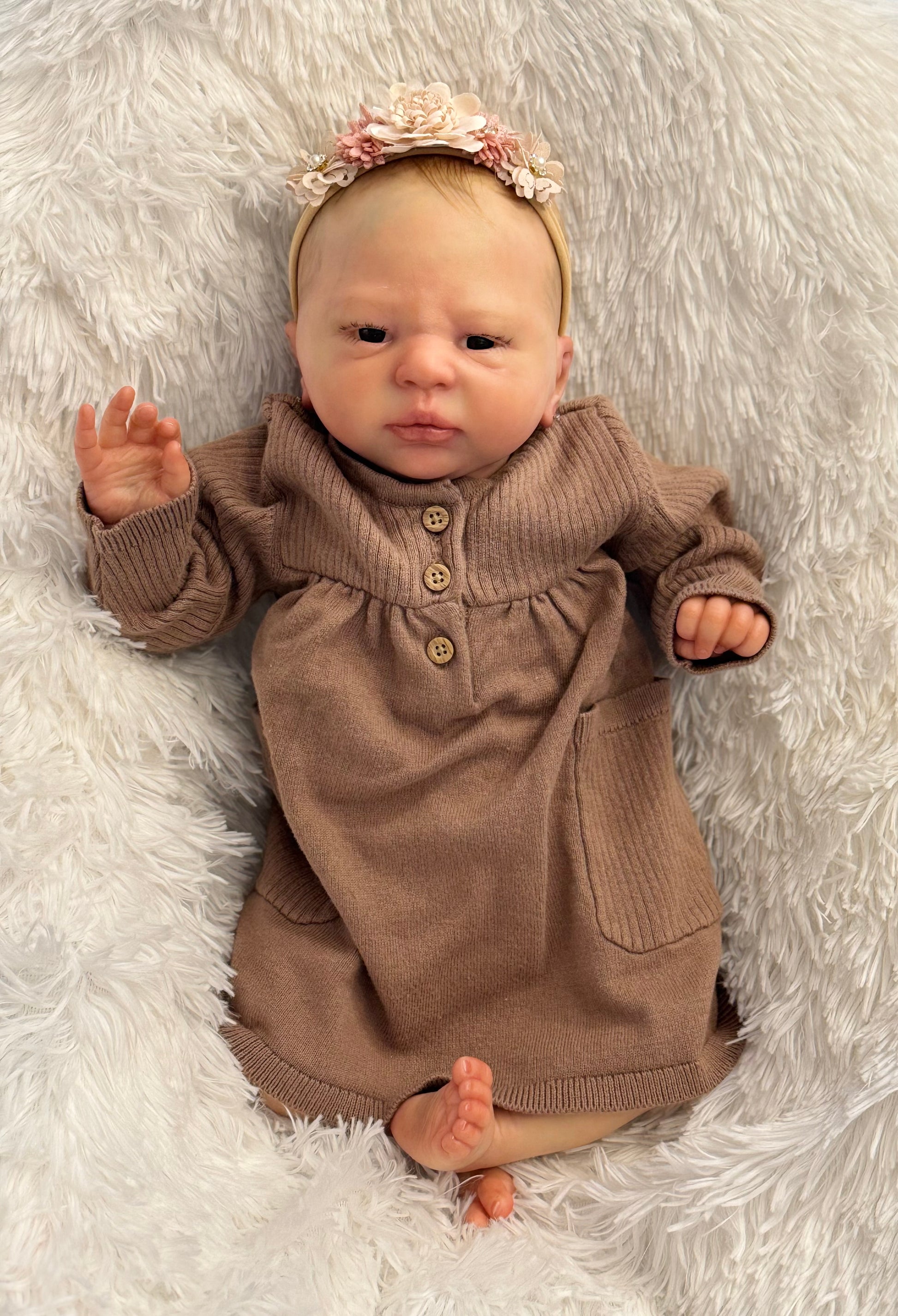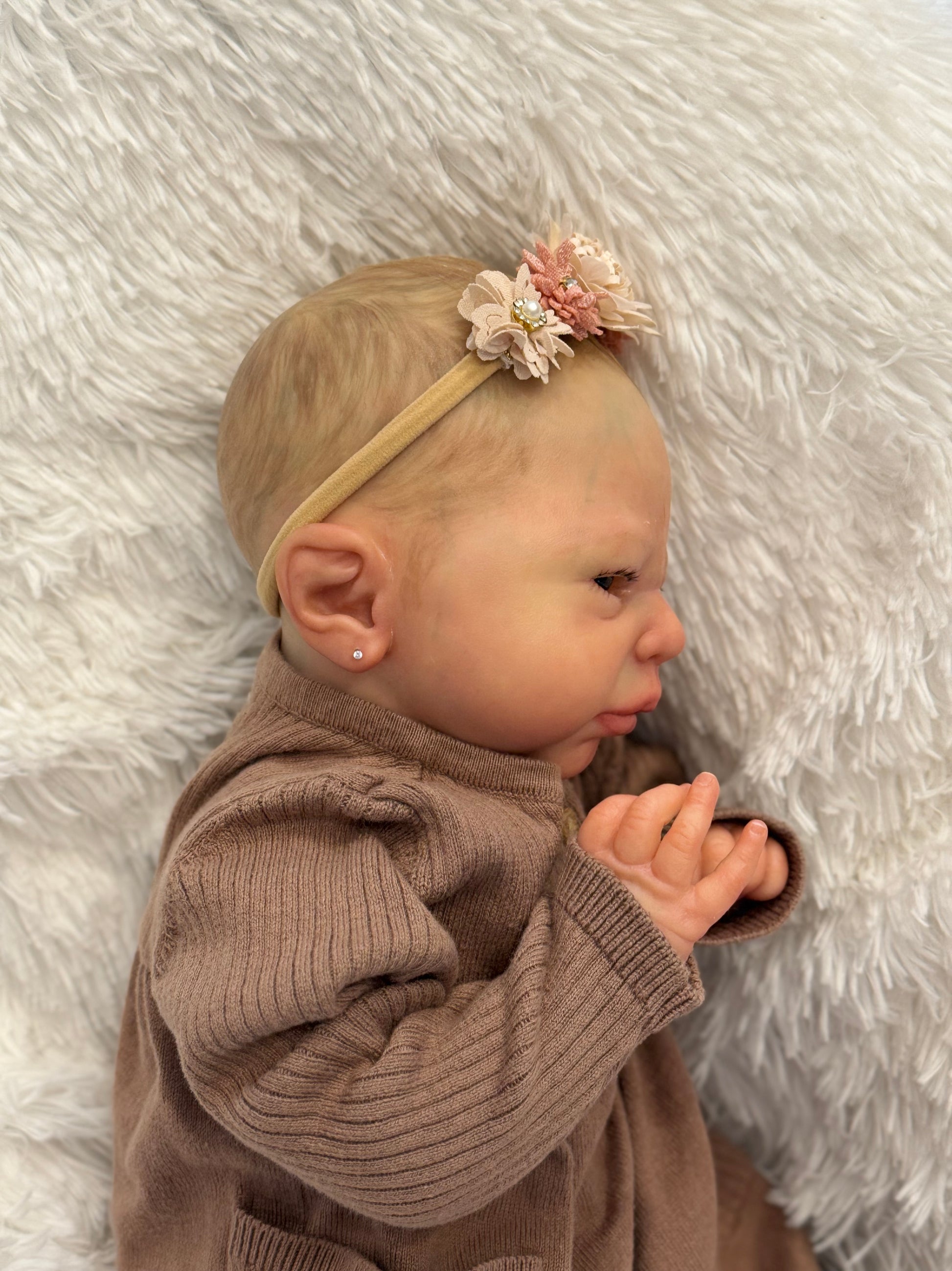 Neikie is a sold out limited edition doll by Sabine Altenkirch 437/599. She has been painted with heat set paints, and has combi hair (painted with mohair that has been microrooted on top). She has her ears pierced and comes with a magnetic pacifier.